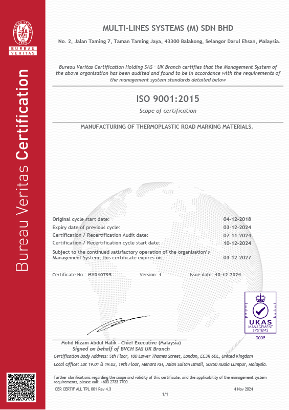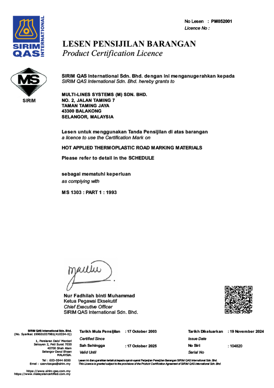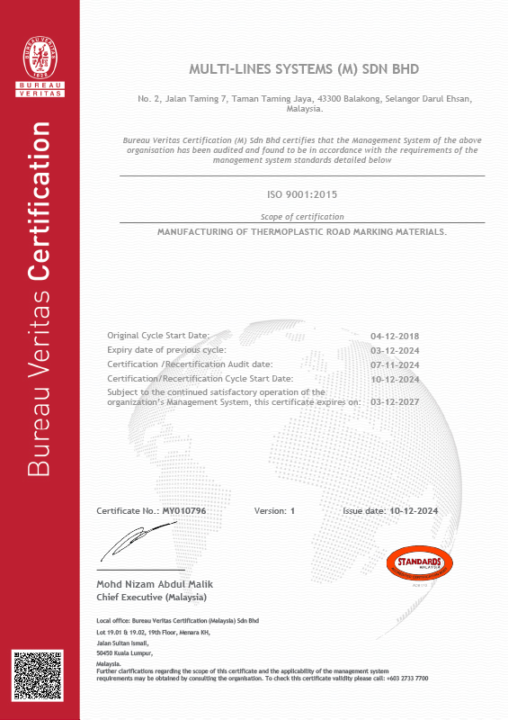Multi-Lines Systems (M) Sdn Bhd was incorporated in November 1999 with its principal activity being the manufacturer of Thermoplastic road marking material. The actual production started in May 2000, and ever since, the production output has been increasing steadily to an average of 400 tonnes per month.