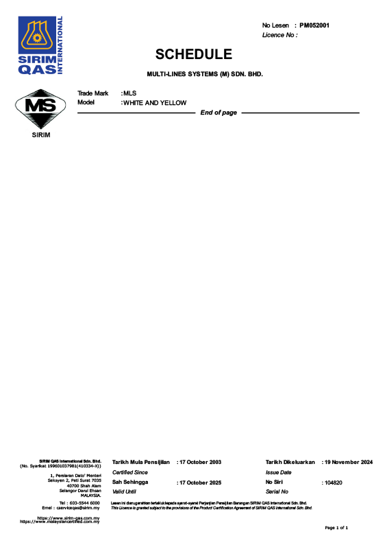 We have also obtained our SIRIM Product Certification (License No: PM052001) from SIRIM QAS International Sdn Bhd on the 17th of October 2003 and the ISO 9001:2015 Quality Management System certification from Bureau Veritas.